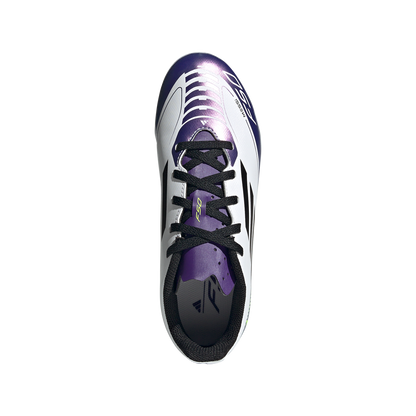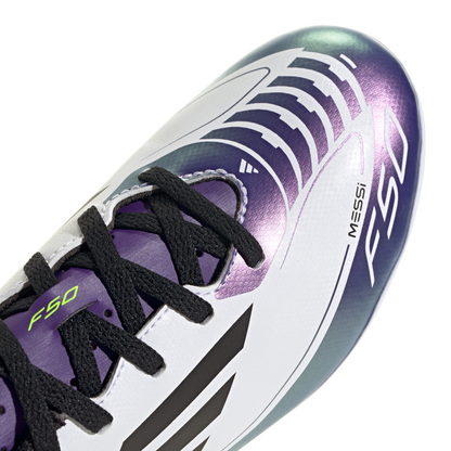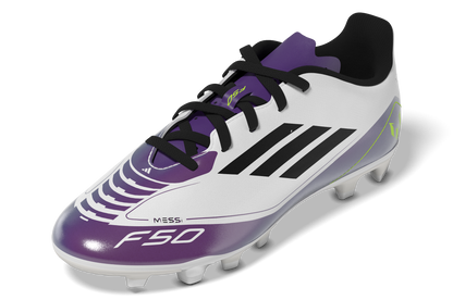 F50 speed, Messi style. In 2024, Lionel Messi's range of adidas football boots are crafted to match his preferences even more closely. Soft and supportive, the synthetic upper on these juniors' F50 Club boots includes a lightweight tongue for added comfort. Underneath, a versatile outsole helps you weave spells on a variety of surfaces.