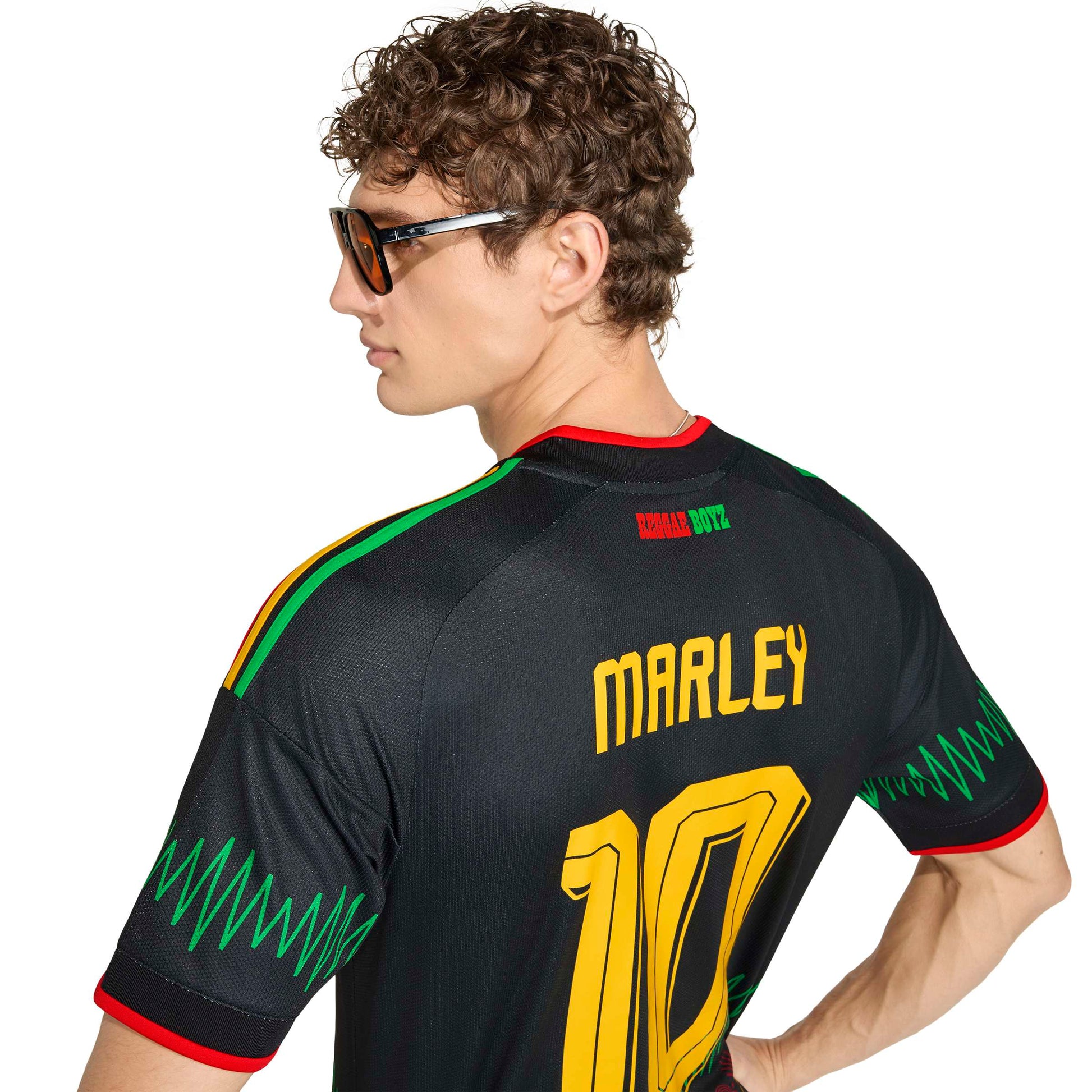 Celebrate the spirit of reggae music with the Jamaica 26 x Bob Marley Away Jersey. Inspired by Bob Marley's legacy and designed for on-field match usage, it combines performance with cultural expression. Cool. Dry. Ready. The jersey features adidas' Climacool technology. Climacool wicks and disperses sweat for a cool, dry and distraction-free performance. The ribbed crew-neck collar adds a touch of classic style, while the slim fit offers a modern silhouette. Crafted from doubleknit fabric, this jersey is not only stylish but also practical, making it a must-have piece for a football enthusiast looking to celebrate Jamaican heritage.