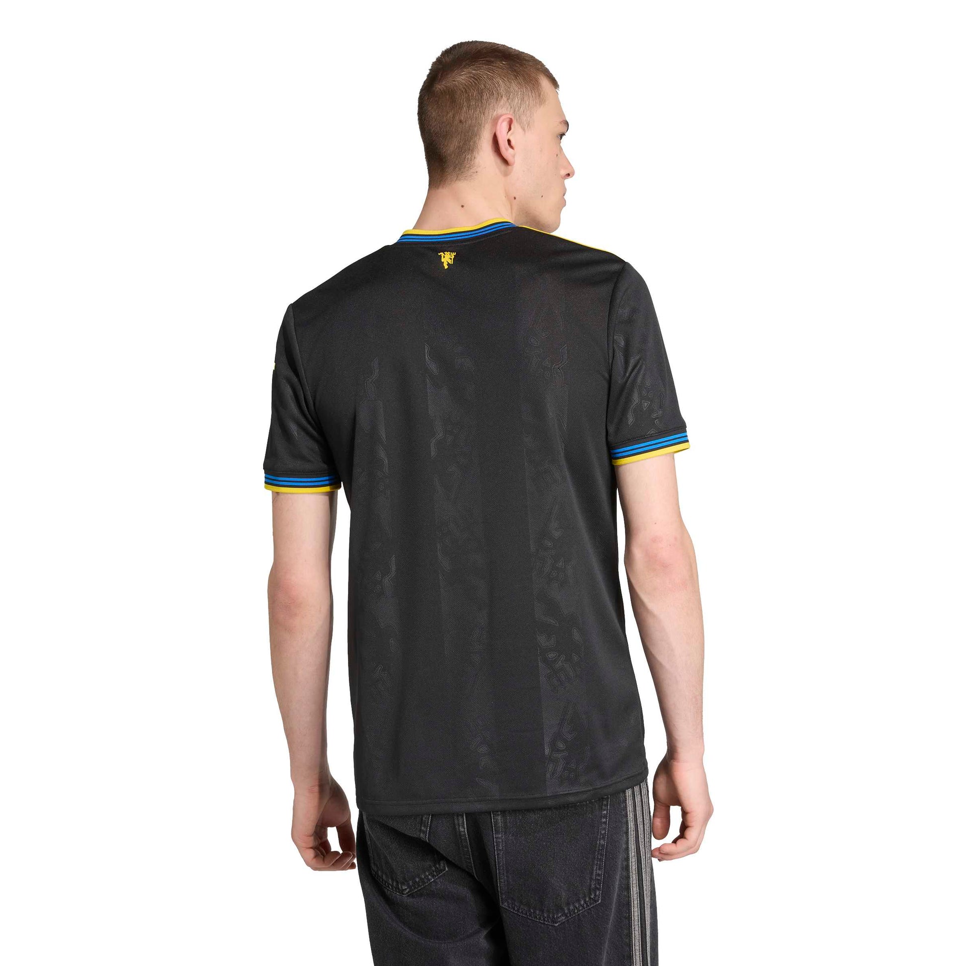 Part of a clean, classic adidas kit that will transport fans to a golden era. Finished in black, this Manchester United third jersey conjures some of the club's most iconic players and memorable away performances. A yellow Trefoil and club badge stand out on the chest while more subtle, devilish details are woven into the fabric. Moisture-managing AEROREADY keeps fans comfortable while their team create new memories.